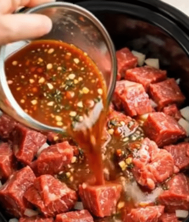 Slowly drizzle the wine mixture over the beef and vegetables, ensuring every piece is moistened. Cover the slow cooker and cook on LOW for 8–9 hours or on HIGH for 4–5 hours. The long cooking time allows the beef to become tender while the vegetables absorb the sauce, melding the flavors into a rich, comforting stew. By the end of the cooking process, the meat should be fork-tender and the vegetables soft but intact.